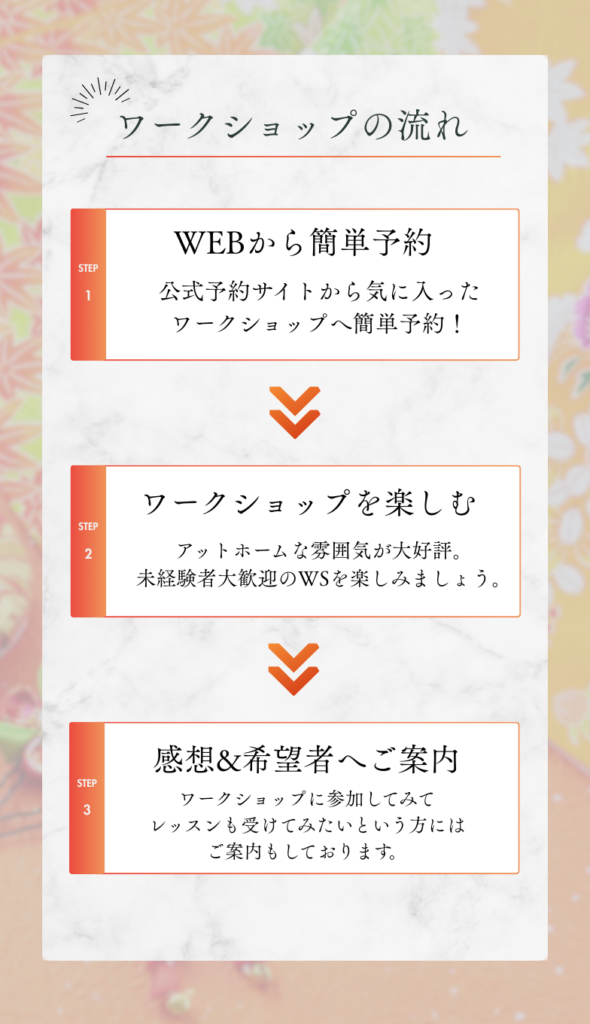 WS当日に何でもご質問ください。生徒さん達もWSに参加されてることもあるので感想も聞けると思いますよ。
